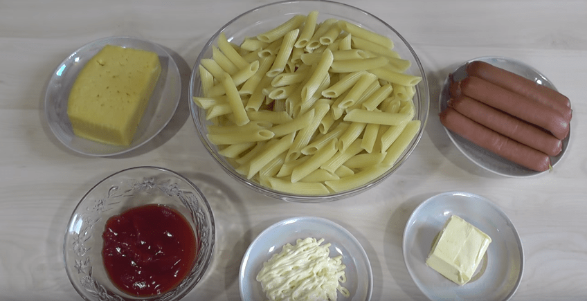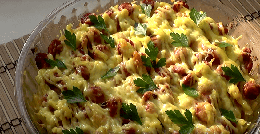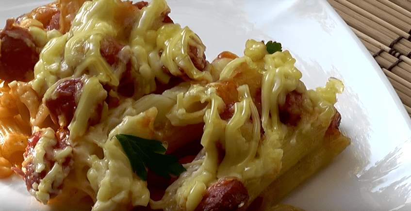 Такой рецепт очень часто называют «ленивой запеканкой». Он идеально подходит в том случае, если у вас остались с обеда сваренные макароны, а в холодильнике уже давно лежит кусок колбасы или сосиски.