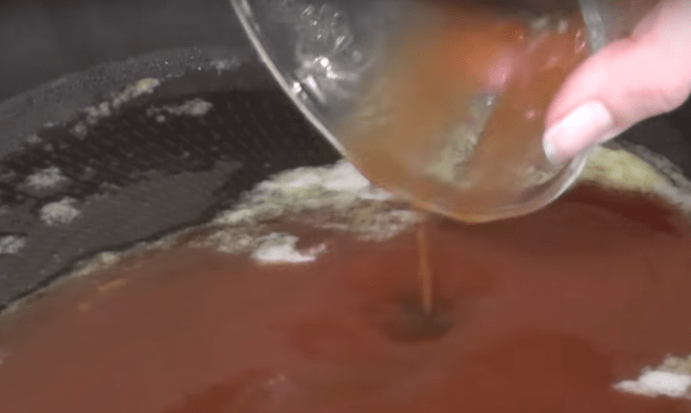 2. В томатную пасту добавляем 5 столовых ложек холодной воды, смешиваем и выливаем в сковороду со сливочным маслом.