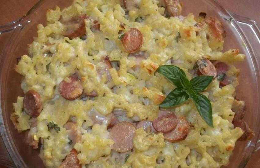 Макаронная запеканка с грибами, сосисками, яйцом и сыром в духовке