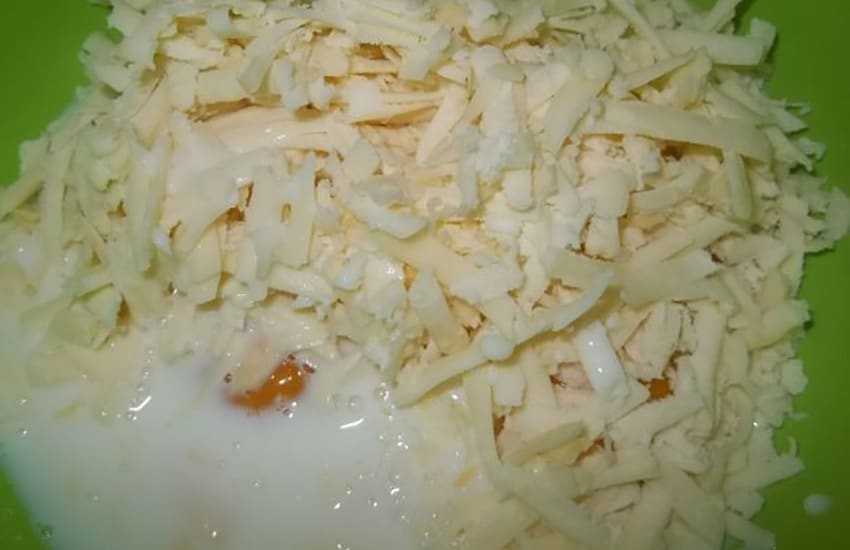 5. Для заливки: в миску с луком и морковью, кладем нарезанный кусочками плавленый сыр, вбиваем яйца. Все взбиваем погружным блендером до однородности, солим, перчим и заливаем молоком, перемешиваем.