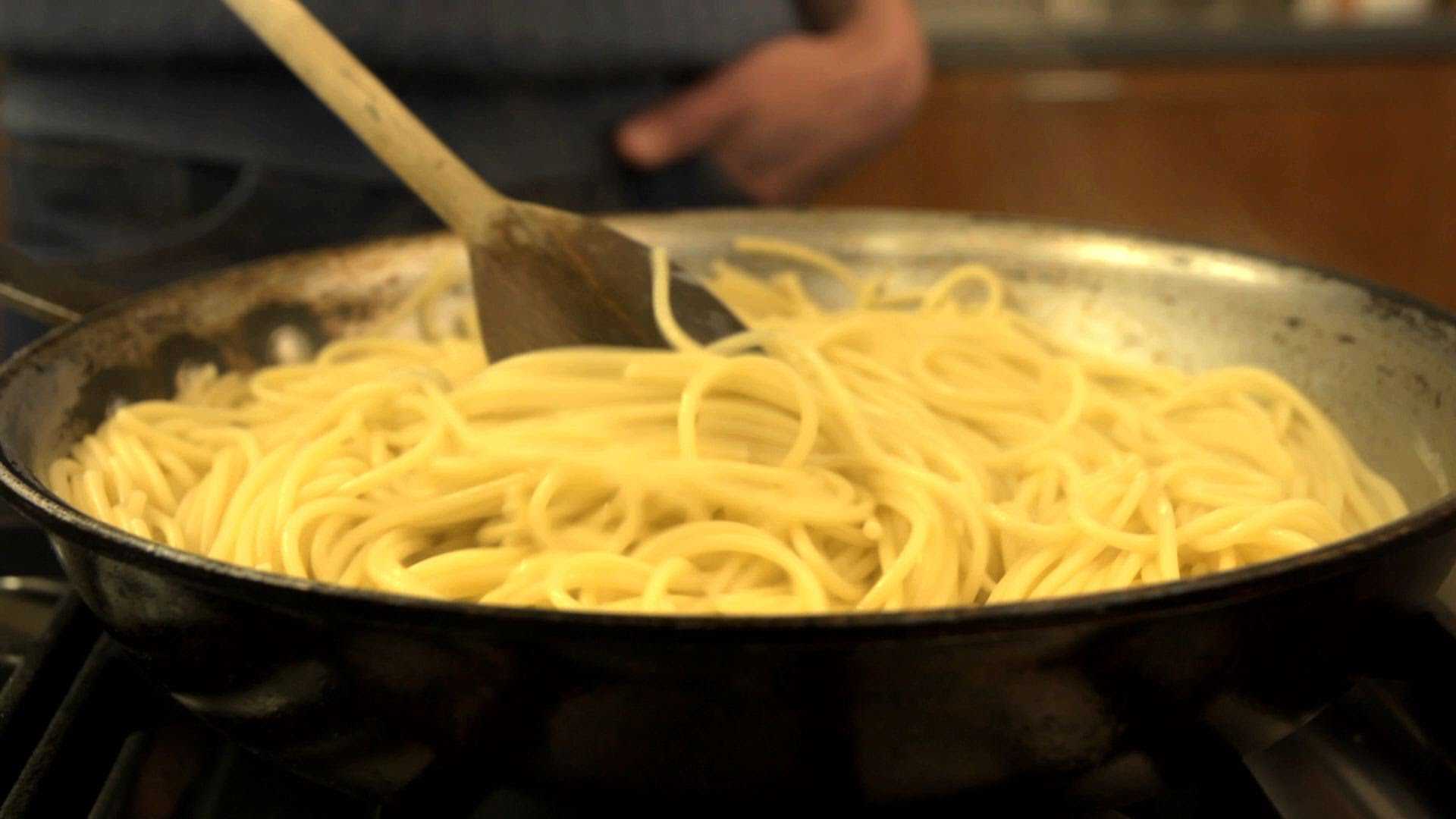 - В кипящую подсоленную воду поместить спагетти (не ломать). По количеству воды мнения расходятся: некоторые предпочитают варить в большом количестве воды, другие – в малом. Здесь главное сварить их до состояния аль дэнте – когда, они еще слегка сыроваты, немного похрустывают, но уже свисают с вилки.
